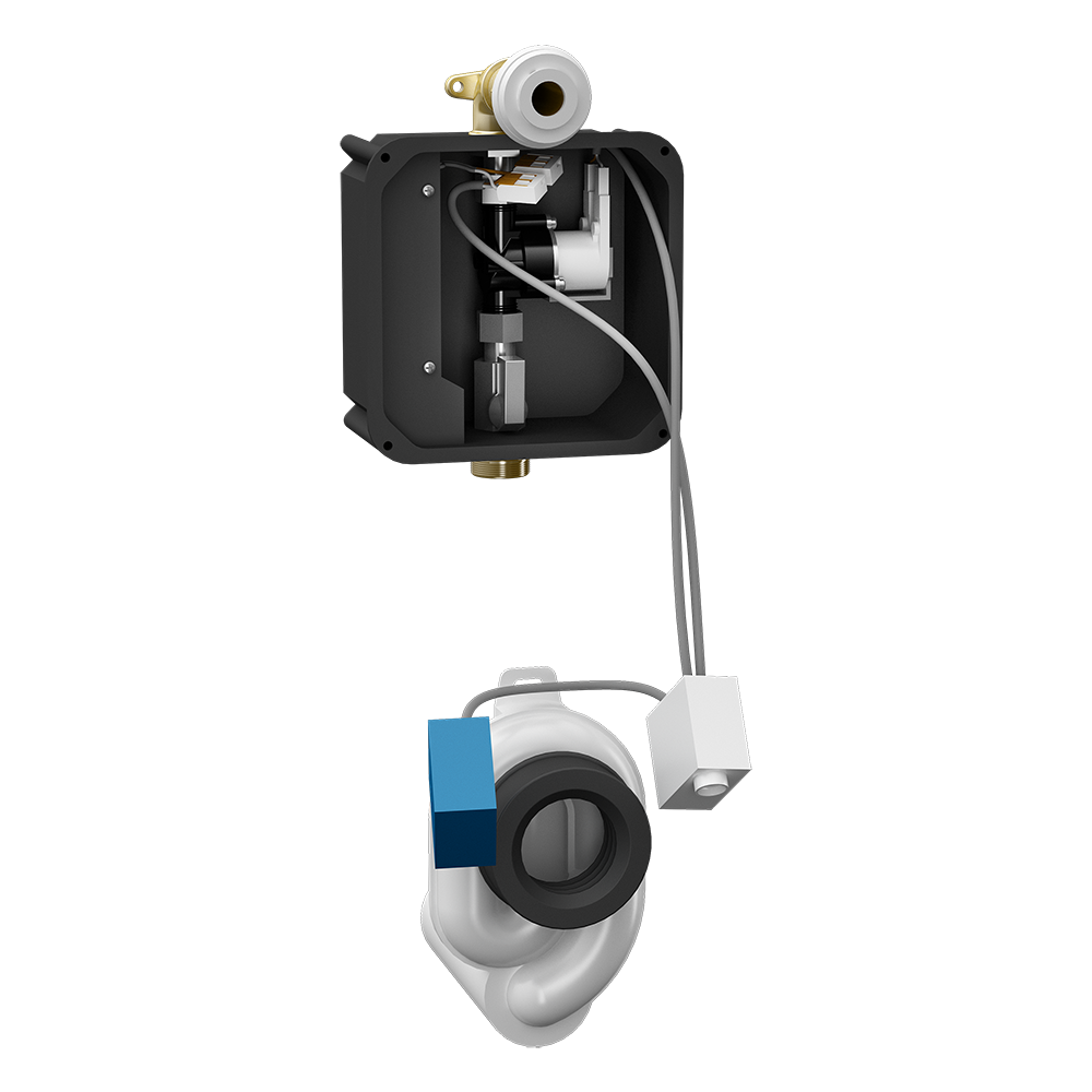 SLP 37RZ - Supply No. 01375 - ceramic urinal with the radar flushing unit including Bluetooth module, plastic mounting box with brass screw coupling, electromagnetic valve and ball valve, inlet fitting with a rubber sealing, siphon, mounting set, plastic cover, power supply